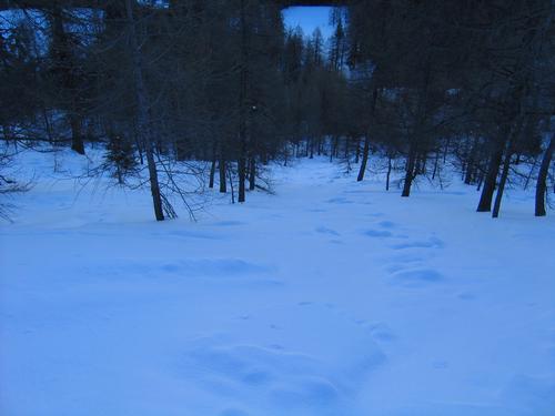 | Stellenweise steilerer, dichterer Wald mit harten Spuren unter der neuen Pulverauflage machen die Abfahrt Richtung Untere Scharhütte nicht ganz einfach. |