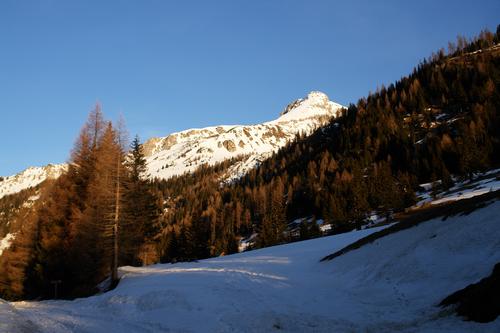 | Zeitiger Aufbruch beim Parkplatz in Wald. Einige wenige Schitourengeher (eigentlich nur für Anrainer erlaubt) fahren bis zum Schranken der Mautstation. Spätestens aber dann geht es per Schi über die Straße ins Riedingtal. Das Gr. Mosermandl liegt bereits in der Morgensonne. |