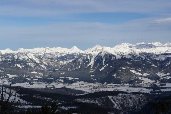 Gute Ausblicke über das steirische Salzkammergut bei Bad Mitterndorf zum Toten Gebirge. In der Mitte der schneebdeckte Elm.