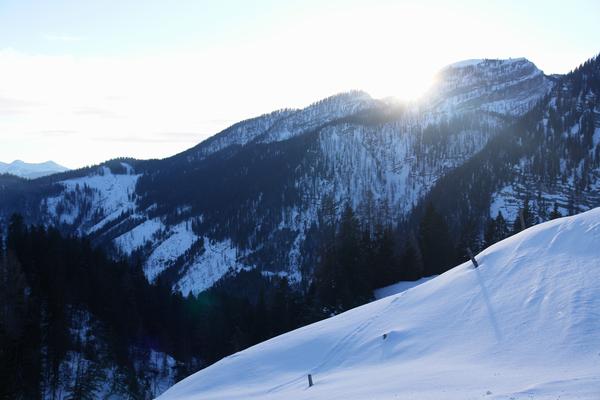 Die Sonne wird sich bald hinter das Gelände zurückziehen, über welches ich heute morgen - großteils im Finsteren - aufgestiegen bin. Deutlich erkennt man die Forststraße im linken Bildbereich.