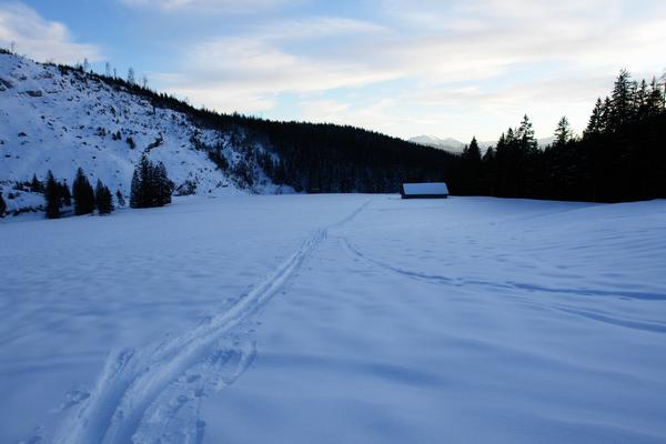 Im Wald neben den am späten Nachmittag nur mehr spärlich befahrenen Pisten hinunter zum Hintersteinermoos ...