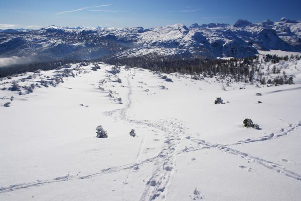 Blick über die Aufstiegsspur zurück - über das weitläufige Dachsteingebirge.