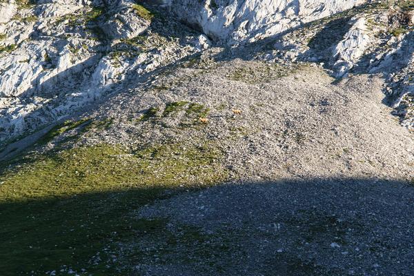 | Als um mich herum nicht nur die bereits erwähnten Schafe herumwuseln (dutzende bis hunderte), sondern auch immer wieder größere und kleinere Gamsrudel den Weg kreuzen (Bildmitte), fühle ich mich unversehens an Bernhard Grzimek´s Film "Die Serengeti darf nicht sterben" erinnert, so als ob Tausende von Antilopen an mir vorbeiziehen würden. |