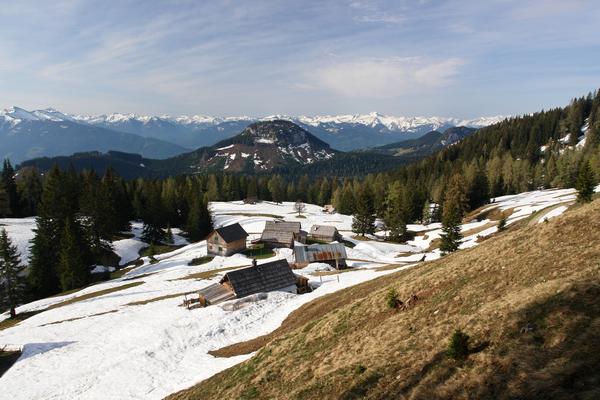 Aufstieg über die Südhänge. Ausblick über die Alm und den Nojer (oberhalb der Bildmitte) hinweg in die Niederen Tauern.