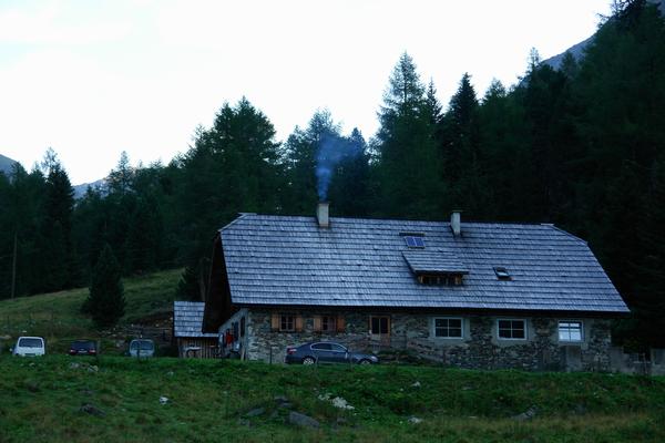 Bei den großen Gebäuden der Hinteren Lignitzalm vorbei, wo bereits kräftig eingeheizt wird und sich ein erster Übernächtiger vor der Haustüre zeigt.