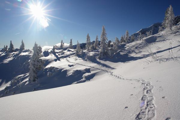 Voller Genuß ziehe ich meine Spuren im frischen Pulverschnee. Einige ältere Schispuren sind bereits weitgehend eingeweht.