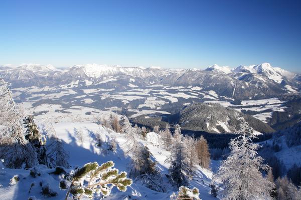 Vom Gipfelchen überblickt man gut den weiten Talkessel um Abtenau. Dahinter die Salzkammergutberge im Bereich der Postalm.
