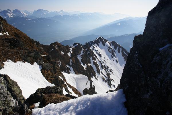... kann aber dank der gut ausgetretenen Trittspuren im harten Schnee und Eis darauf verzichten. Ausblick nach Osten zum Gipfelkreuz am Almspitz.