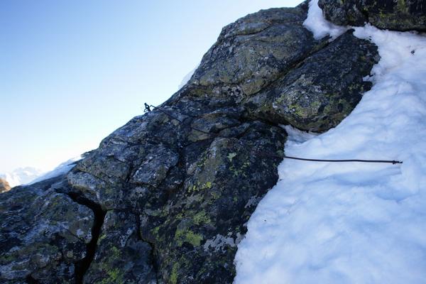 Über glatte Steinplatten - weiter oben schneebedeckt - helfen Drahtseilsicherungen hinweg.