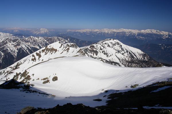 Blick nach Nordwesten über den Moserspitz (links) bis zum Stein am Mandl (rechts) - der Grat, den ich mit Schneeschuhen am 17.01.2009 überschritten hatte.