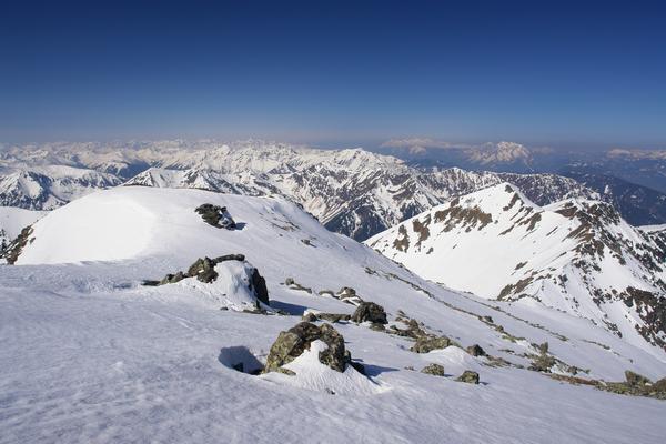 Trotz der noch ziemlich harten Schneeoberfläche im obersten Abschnitt bereitet die Abfahrt zwischen den Felsblöcken hindurch großen Genuß.