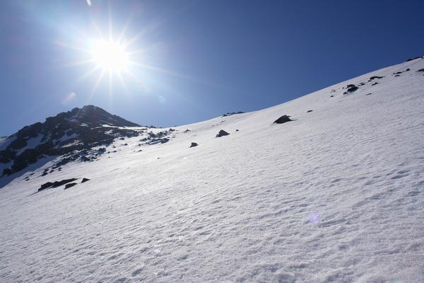 Trotz Sonne gibt es auf den nördlich ausgerichteten Steilhängen keinen Firn.