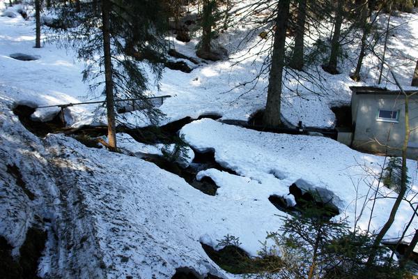 Bis zur Bachquerung ist bis auf einen kurzen aperen Forststraßenabschnitt die Schneedecke noch gut und ausreichend. Ab hier wird sie bereits ziemlich dünn.
