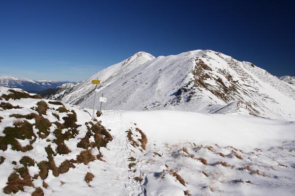 Blick vom Plannerknot zu unserem Gipfelziel, dem Hochrettelstein oberhalb der Bildmitte. Eine Schneeschuhspur (vom Vortag) zieht sich gut erkennbar über die nordwestliche Flanke (links) zum Gipfelspitz.