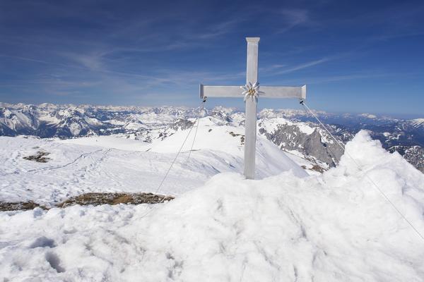 Die Schitourengeher und der Snowboardfahrer, der ebenfalls mit Schneeschuhen aufgestiegen ist, blieben allerdings nur kurz am heftig umwindeten Gipfel. Ausblick Richtung Westen ...