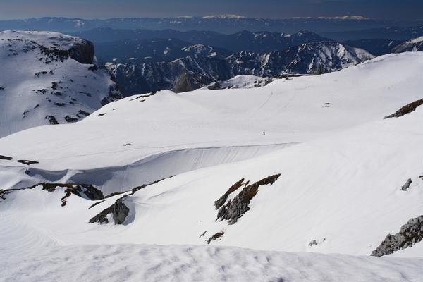 Einsamer Wanderer rechts der Bildmitte. Südlich des Hochwart (links die Stangenwand und unmittelbar davor der Einschnitt des Rauchtales) sieht es mit der Schneedecke noch sehr gut aus. Weiter westlich dagegen müssen die Schi entlang der Stangenmarkierung schon einige Male abgeschnallt werden. |