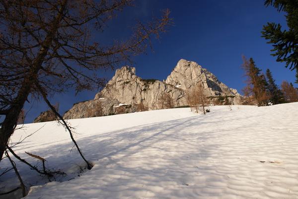 An der Waldgrenze empfängt mich bereits die Morgensonne. Ausblick zu den nordöstlichen Felswänden des Buchbergkogels.