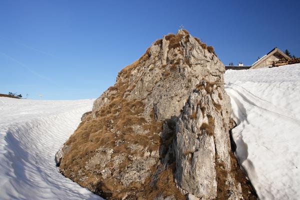 Ein kleiner Felsen mit "Almkreuz" - als Vorgeschmack auf die heutigen Gipfelziele.