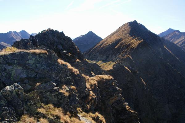 | Im obersten Abschnitt steuern wir (dummerweise) nicht den tiefsten Scharteneinschnitt am Ostgrat des Opferstocks an, sondern wollen einen direkten Aufstieg über die Nordseite versuchen. Diese Route bereitet uns auf Grund des reifigen, gefrorenen und damit harten und rutschigen Bodens einige Schwierigkeiten. Die Schritte sind sehr konzentriert zu setzen, um nicht über die steilen Felswände unter uns abzurutschen. Etwas "gemütlicher" wird es schließlich erst wieder, als wir den Nordgrat teilweise über kurze I-er Stellen erklettert haben. Blick zum Gipfel des Opferstock (links). Rechts der Gamskarspitze. |