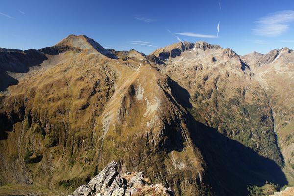 Im Westen erstreckt sich der Höhenzug zwischen Schöneck (links - Besuch am 17.08.2006) und Deichselspitze (rechts - Schitour am 07.04.2006). Dazwischen die Landschitzscharte, die ich auf nächstes Jahr vertrösten mußte.