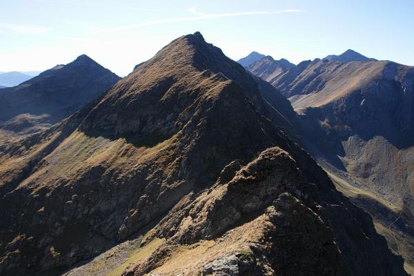 | Über einige leichte, aber teilweise ausgesetzte Turnereien am Nordgrat - und kurz in die steile Westflanke ausweichend - erreichen wir den "ungeschmückten" Gipfel des Opferstocks. Laut Alpenvereinsführer "Niedere Tauern" von Peter Holl soll von hier die Gamskarspitze (oberhalb der Bildmitte) durchwegs über Gehgelände entlang des unschwierigen Gras- und Schuttgrates erreichbar sein. Eine Einstufung, der ich nicht zustimmen kann. |
