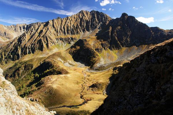 ... bis wir auf die bereits erwähnten Felsbbrüche gelangen. Zur Not hätten wir uns entlang der steil abfallenden Grabeneinschnitte zwar hinunter zum Roßboden hanteln können, der von einem mäandernden Bächlein durchzogen wird ...