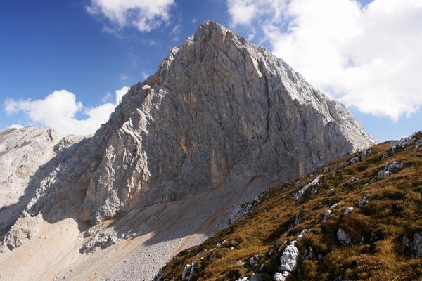 Imposant zeigt sich die Westseite des Großen Hundstod. Über die Schotterhänge unter den Felsen werde ich wenig später nach unten rutschen.