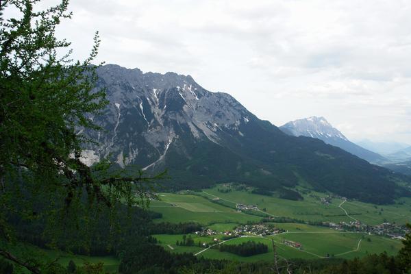 Blick vom Freienstein über den Talkessel um Gröbming-Winkl. Rechts hinten im Dunst - der Grimming. Links thront groß der Kammspitz. An seinem rechten Ausläufer der unscheinbare Fortsatz des Wintersteins.