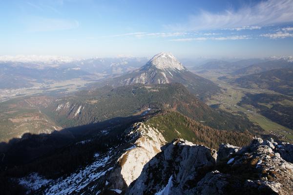 Im Osten zeigt sich der Grimming als trennender Felsklotz zwischen dem steirischen Salzkammergut auf der linken und dem steirischen Ennstal auf der rechten Seite.