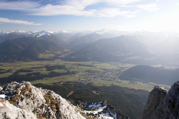| ... und dahinter die Niederen Tauern. Links die nördlichen Wölzer Tauern mit dem Gumpeneck, rechts - durch den Grabeneinschnitt des Großsölktales getrennt, wo man den weißen Schimmer des Stausees erkennen kann, die Schladminger Tauern, mit dem die Gipfelnachbarn überragenden, gestern besuchten Grossen Knallstein im dunstigen Hintgergrund. |