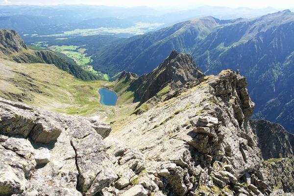 | Weiter vorne der plattige Grat, über den ich von der anderen Seite heraufgekommen bin. Absteigen werde ich jetzt aber links hinab, wo ich im Bereich einer steilen Wiese wieder auf einige größere Steinmandln und ein sich in engen Kurven nach unten schlängelndes Steiglein treffe. |