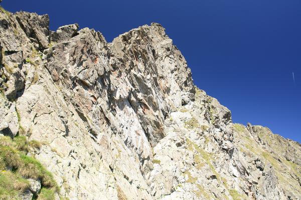 Unten den überhängen Felswänden vorbei, wechselt der Weg später etwas nach links hinüber in eine schottrige Erdrinne.