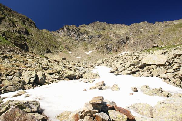 Das eine oder andere Schneefeld könnte zwar auch leicht umgangen werden, das Abrutschen im Schnee erspart aber etwas Zeit, und eine wadenerfrischende Abwechslung ist es allemal.