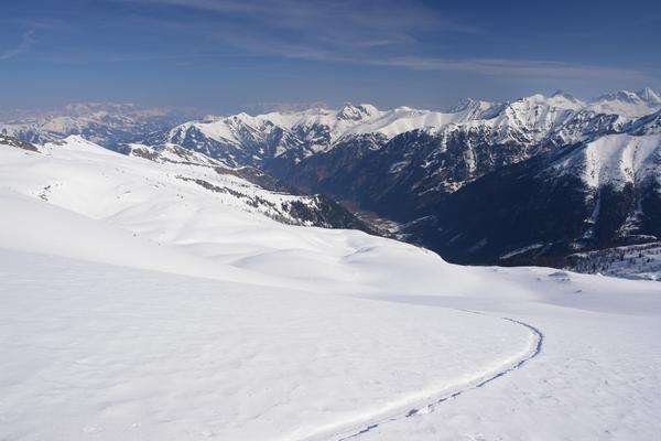 Ich folge nun im Wesentlichen einer Schispur, die teilweise aber bereits wieder mit feinem und rutschigem Schneestaub eingeweht wurde.