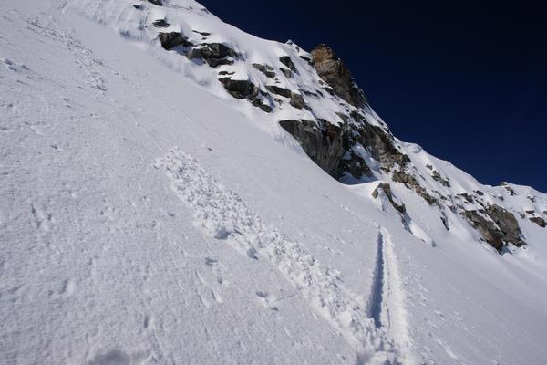 Nordöstlich des Keesnickelkopfes erreicht man die Gletscherreste des Gstößkeeses. Hier kommen immer wieder kleine, harmlose Nasschneerutsche aus den Felsen.