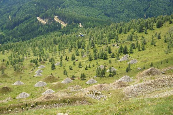 | Schon von der Kreuzhöhe habe ich immer wieder Hubschrauber-Geräusche vernommen. Beim Abstieg vom Gumma wuchs sich dieses Geräusch zu einem richtiggehenden Lärm aus. Immer wieder flog der Hubschrauber kurz weg, um gleich danach mit weißen, auf einer Palette liegenden Säcken zurückzukehren. |