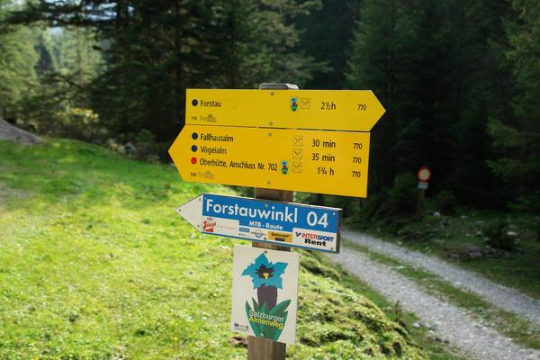 | Wir starten unsere Tour im Forstautal auf halbem Weg zwischen Unterer Weitgaßalm und Hintereggalm, etwa 2 Kilometer vor dem Ende der staubigen Forststraße bei der Vögeialm. In der Freytag&Bernd-Karte ist die Tour zwar als markierter Wanderweg eingezeichnet, vor Ort haben wir aber keinerlei Wegmarkierungen gesehen. Zuerst geht es nach rechts einige Meter hinunter zum Forstaubach, den wir über eine kleine Brücke überqueren. |