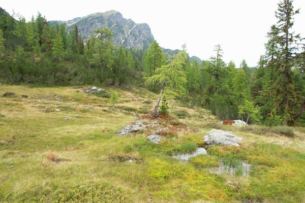 Wir folgten dem ansatzweise erkennbaren Steiglein über Almwiesen, die bei schönerem Wetter und besserem Licht mit Sicherheit einen großen Reiz versprühen würden.