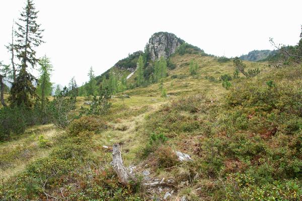 Im Umfeld dieses Felsköpfels halten wir uns links. Ein guter, wenngleich zeitgweise steiler und leicht ausgesetzter Steig, führt abwärts ...