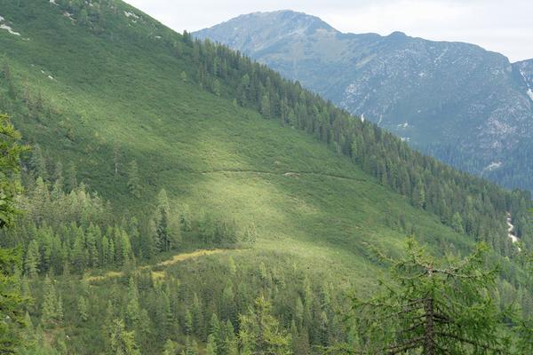 Auf der gegenüber liegenden Waldseite - der Südseite des Laitternkogels - erkennen wir etwa im Bereich der Bildmitte die schmale Latschengasse, über die wir aus dem rechtsseitigem Wald nach links herüber gequert sind.