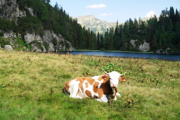 | Die Kühe, die sich um die Mittagszeit wie auf Kommando alle gemeinsam niederlegten, wunderten sich über die 2 Nackedeis wohl ebenso, wie der wenig später mit einer Angelrute erscheinende Senner, der sich fischenderweise für seinen abendlichen Speiseplan etwas Abwechslung fangen wollte. |