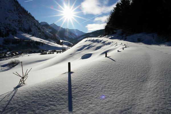 Spuren waren keine vorhanden - erst beim Abstieg traf ich im untersten Abschnitt auf Schneeschuhspuren (ein großes und ein kleines Paar - den Rahmeneindrücken zu urteilen vermutlich Tubbs-Modelle).
