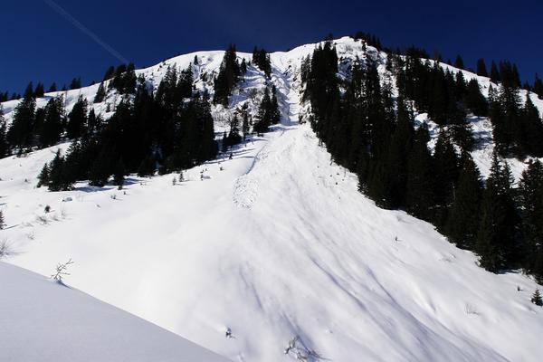 Der Höhenzug, der die Ahornkoglalm von der Finsterkaralm trennt, am Vormittag. Ein kleiner, unscheinbarer Lawinenrutsch (Siehe auch nächstes Foto).