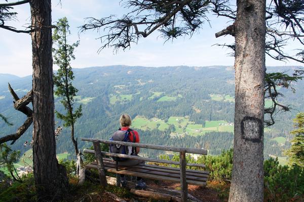 In diesem Fall glauben wir aber dem Wegweiser und lassen uns kurz zu einer Rast am Gipfelbankerl nieder.