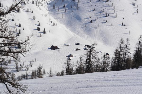 ... die Hütten der Niederhüttenalm und links die in der Größe herausragende Hochmölbinghütte.