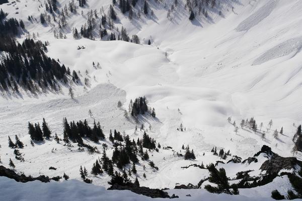 Aus allen Richtungen ziehen Lawinenspuren in den Kessel hinunter. In Bildmitte - winzig - 3 Schitourengeher.