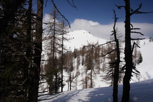 Nach kurzer Abfahrt über den licht bewaldeten Nordhang felle ich wieder an und steige nordwärts auf. Schon bald zeigt sich mein nächstes Gipfelziel ...