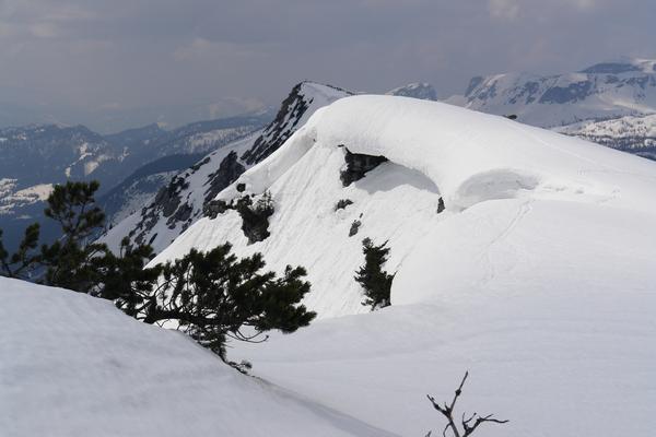 Drüben am Westgipfel (im Schatten links oberhalb der Wechte) sind immer wieder einige Besucher erkennbar.