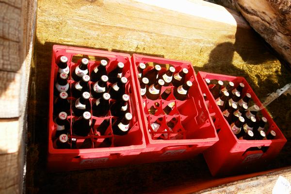 | Zuallererst aber mußten wir - selbstverständlich nur aus medizinischen Gründen - unseren Körpern die zuvor ausgeschwitzten, aber lebensnotwendigen Salze, Mineralstoffe und andere Nährstoffe wieder zuführen. Optimal vom Quellwasser temperiert, ließ sich das dem Reinheitsgebot folgende Naturgesöff vorzüglich genießen. |