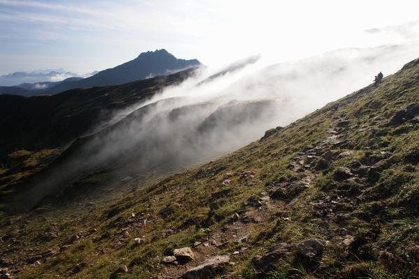 Zwar versuchte er über das Schöntaljoch nach Norden herüber zu drängen, löste sich hier aber rasch im Nichts auf. Rechts am Bildrand Niki und Alex.